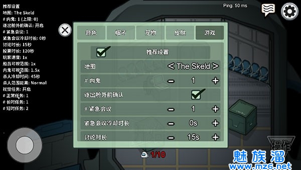 房主可以在等人时设置游戏内的各种属性,比如单个玩家紧急会议次数,会议冷却,击杀冷却,击杀距离,讨论时间(最好设较短的时间),投票时间(随意,通常为60秒),长、中、短任务次数(通常为1、1、2或1、1、1),角色移动速度,船员视野,内鬼视野(最好比船员大)。
