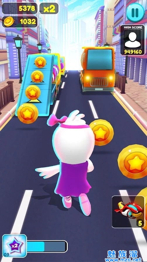 4.操控消极在跑道中跑酷,左右滑动躲避障碍,上下跳动可以上汽车、跨越障碍