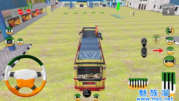 5、以任务模式为例,右侧点击START开始游戏,右侧还有大灯、喇叭、油门、手动挡、油门以及刹车按钮,左侧是方向盘和暂停。
