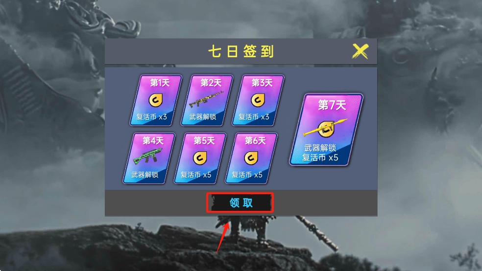 1、点击“领取”按钮,获取每日签到奖励,积累你的复活币和武器解锁机会。