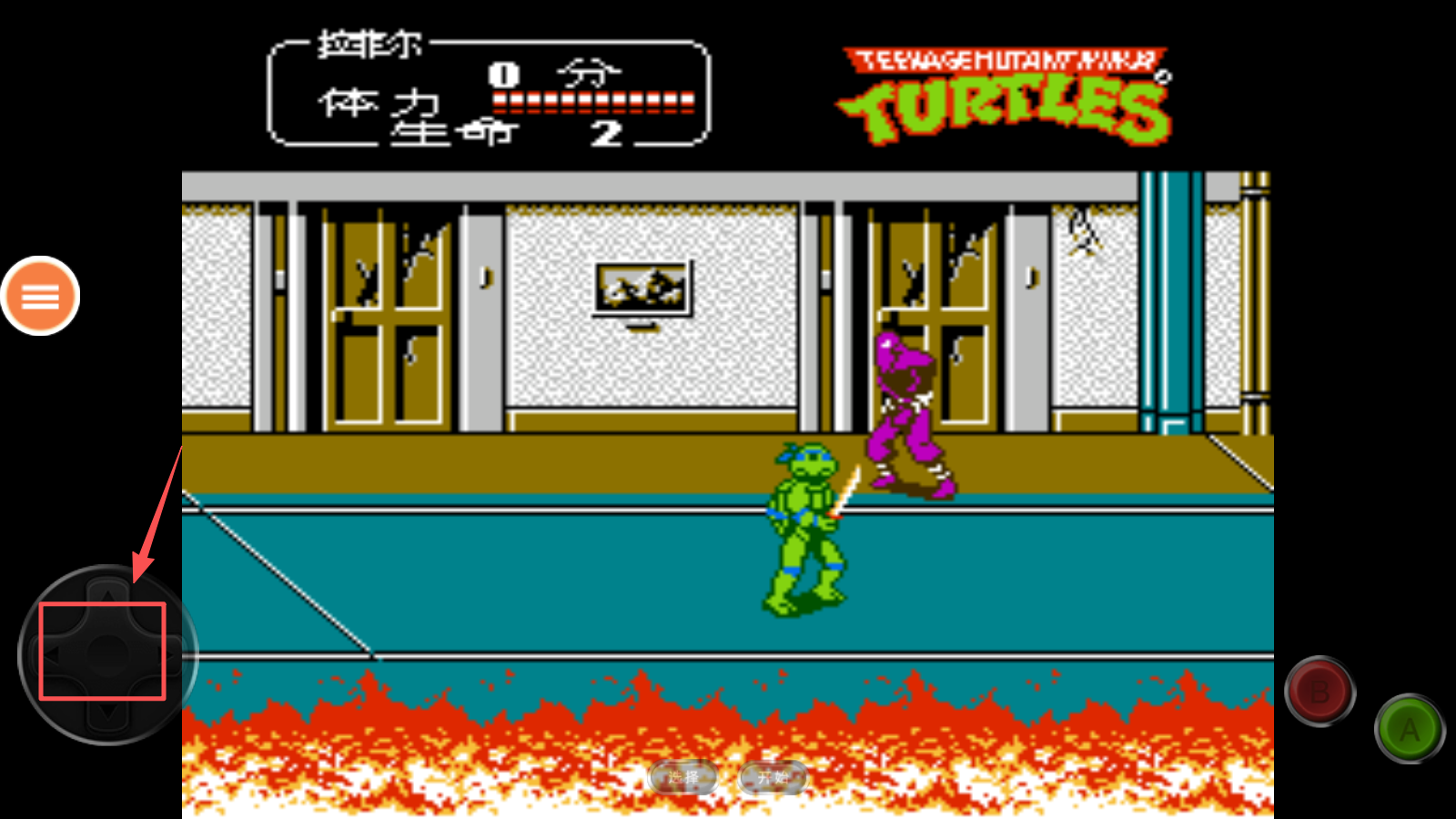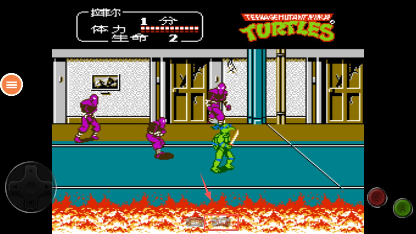 1、首先,查看游戏标题画面,点击“忍者神龟 2”开始游戏。