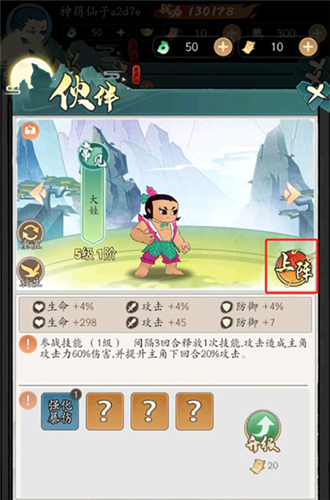 消耗经验符能让伙伴升级,伙伴等级到顶后得用九彩灵叶进阶。而且所有伙伴的等级上限都不能比葫芦娃爷爷的等级上限高。伙伴升级后属性加成会增加,到了特定等级,参战技能等级也会跟着提升。