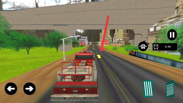 操控大型消防车,顺着画面里黄色箭头所指的道路方向行进,奔赴火灾现场开展任务。
