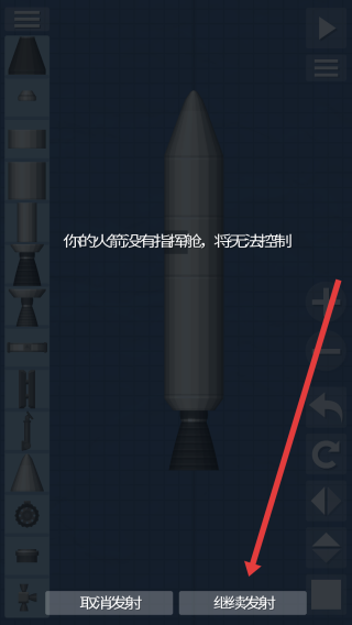 当界面弹出“缺少控制舱导致无法操控”的提示时,若仍希望进行尝试,可点击【继续发射】按钮;若需要对设计进行补充完善,则选择【取消发射】按钮,系统将自动返回至修改页面。