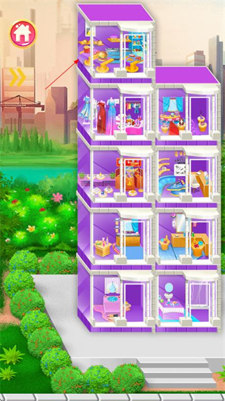 2、于紫色多层楼房的界面里,点击红色箭头所指的厨房区域展开探索,各楼层设有衣帽间、泳池等功能区域。