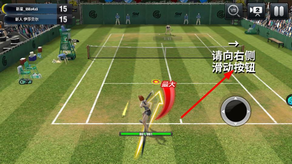 4、通过向右侧滑动按钮,能够对击球方向进行调整,精确地把球击向右侧区域,促使对手移动位置,从而创造进攻机会。